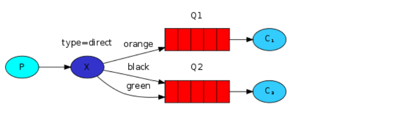 - Direct:其类型的行为是“先匹配、再投送”,即在绑定时设定一个 routing_key,消息的 routing_key 匹配时,才会被交换器投送到绑定的队列中去。