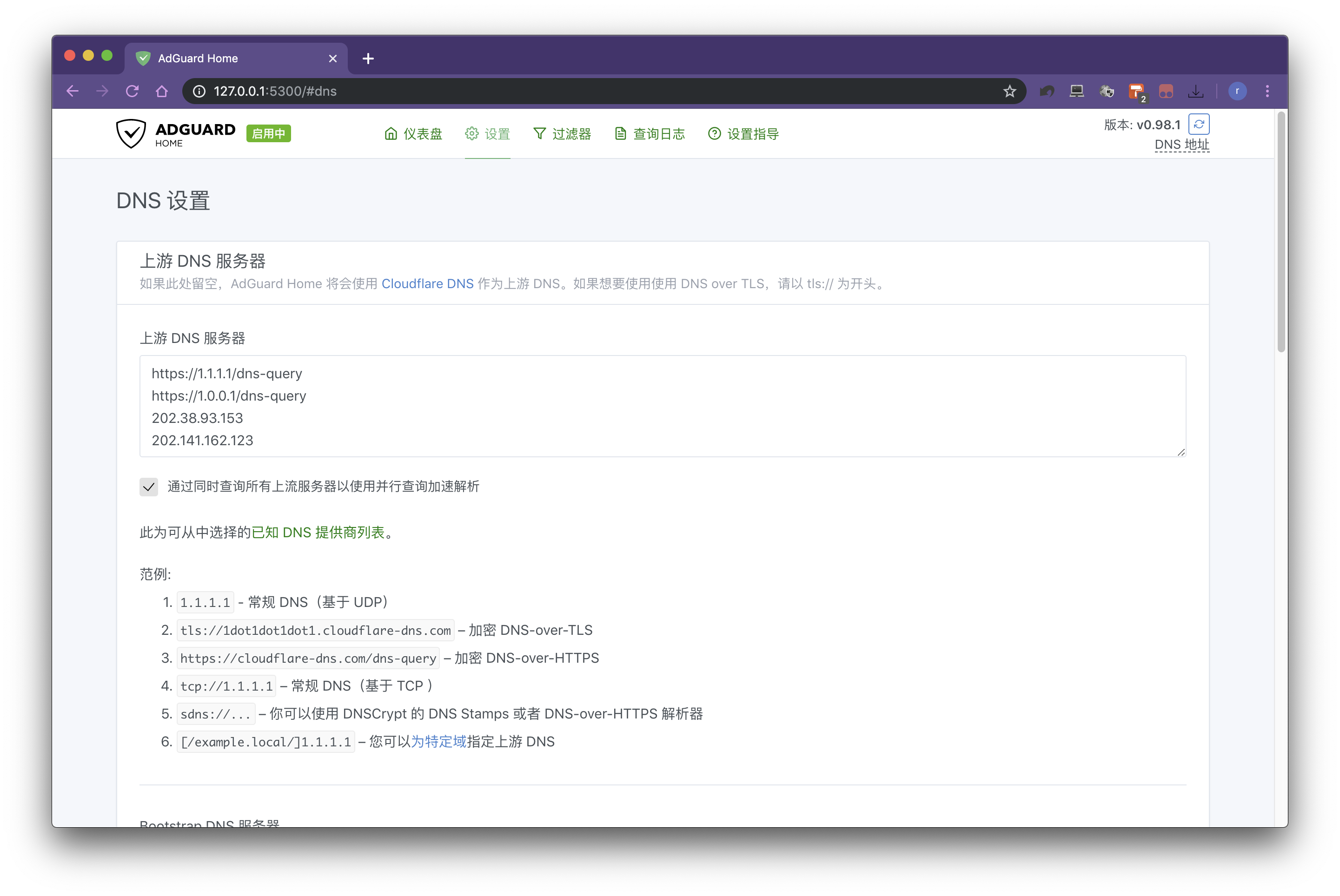 官方默认使用 Cloudflare 的 DNS over HTTPS 作为上游服务器,在国内可能请求上游 DNS 延迟比较高,可以加上或替换国内的 DNS。我自己另外加了中科大的两组无污染 DNS,每次查询的时候会对所有的上游 DNS 同时查询,加速解析。