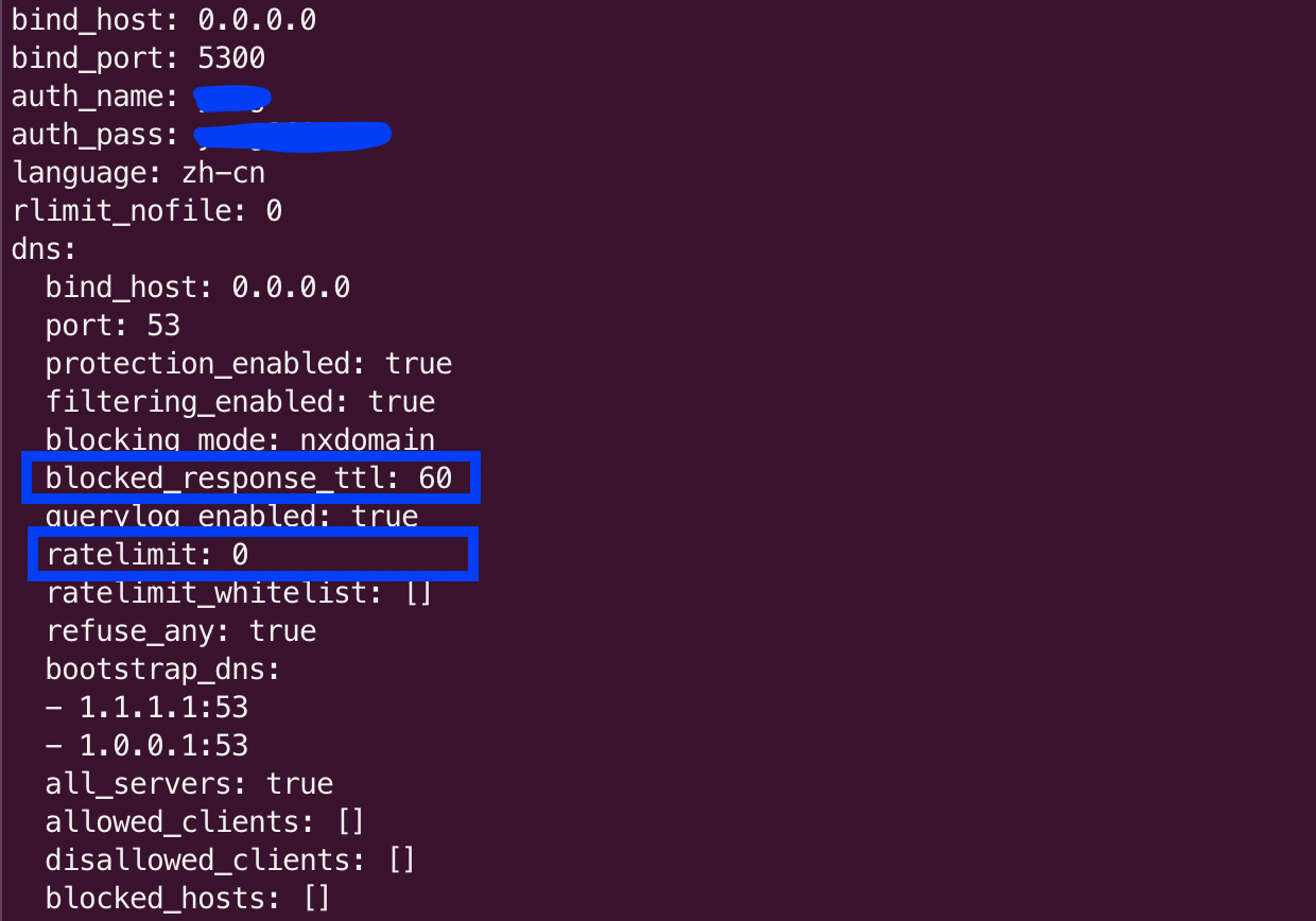 ratelimit: DDoS 保护,客户端每秒接收的数据包数。建议禁用该参数(将值改为 0),默认值是 20。blocked_response_ttl: TTL 缓存时间,建议设置为 60