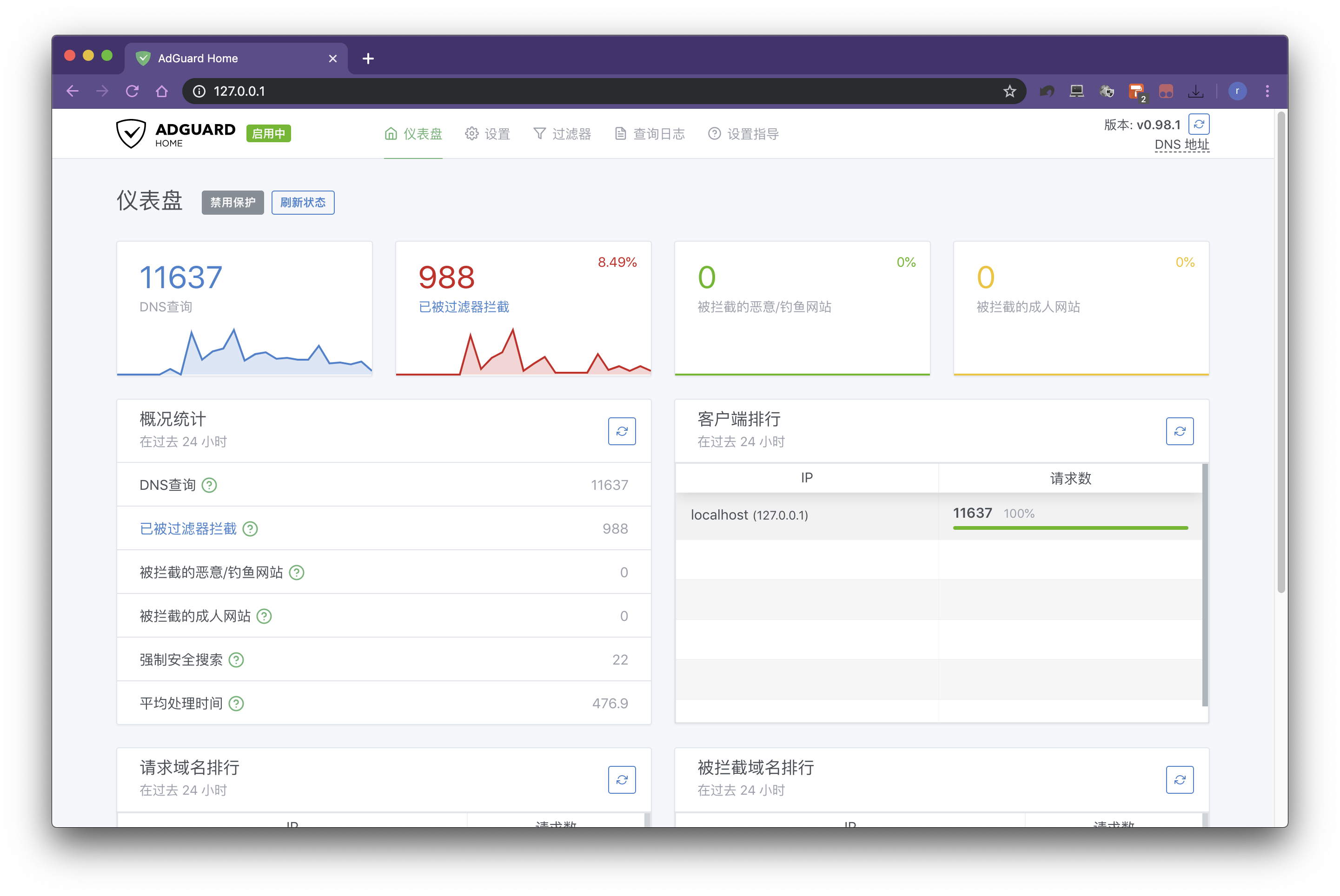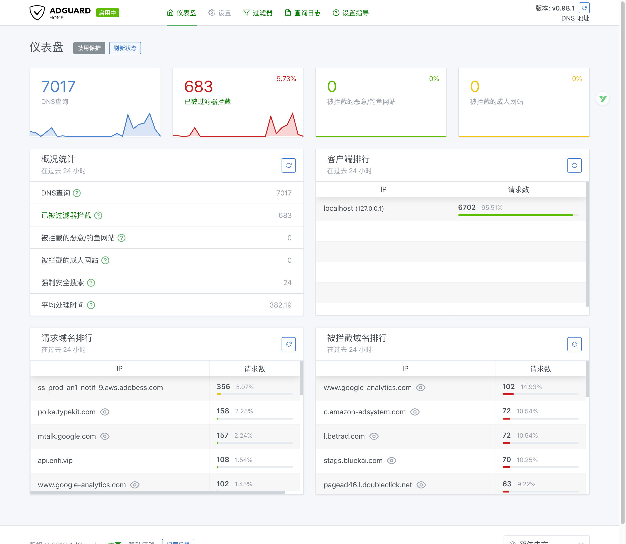 在仪表盘上,我们可以看到 DNS 查询次数、被过滤器拦截的网站、查询 DNS 请求的客户端地址等等信息。