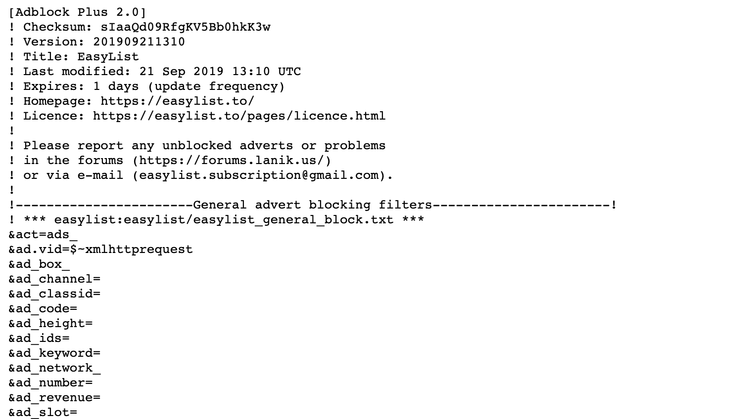 虽然 AdGuard 本身提供了 AdGuard、AdAway 的广告过滤规则,但在中国有点水土不服,如果要想更完美的实现广告屏蔽还需要自己添加规则,AdGuard 可以兼容 Adblock 的语法。最知名的过滤规则 EasyList 就是由 Adblock Plus 团队维护,过滤规则往往是一个 txt 文件,在文件的开头部分会显示规则的最后更新日期。