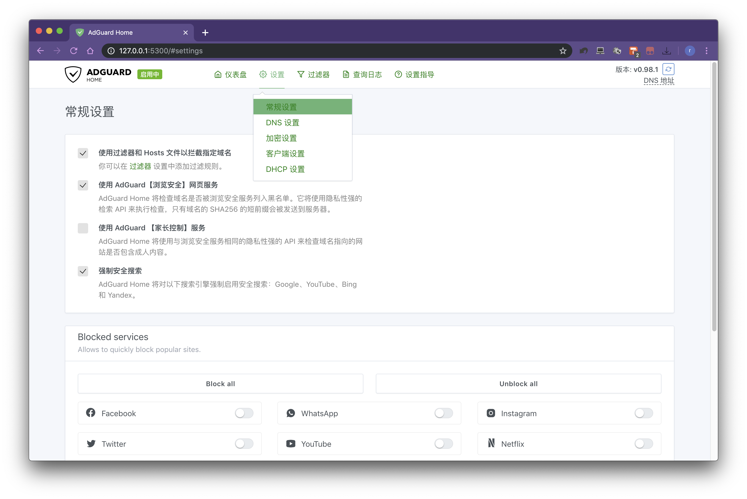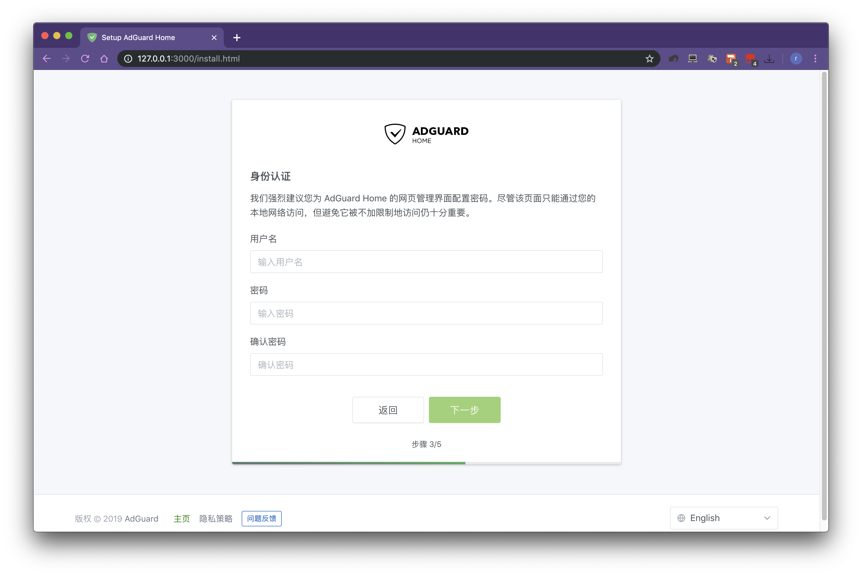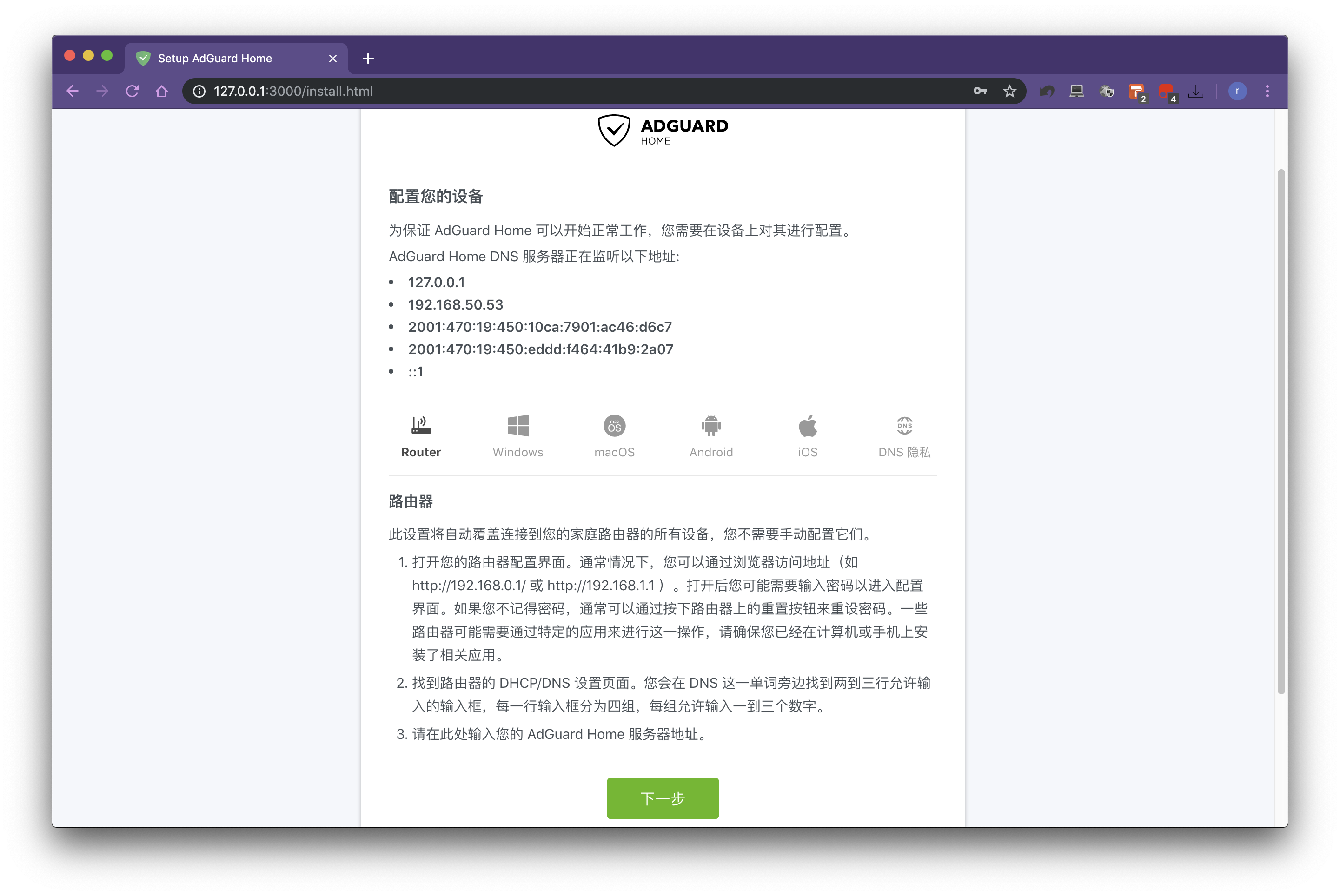 打开浏览器,输入网址 http://127.0.0.1:3000/ 即可访问 AdGuard Home 的管理界面。