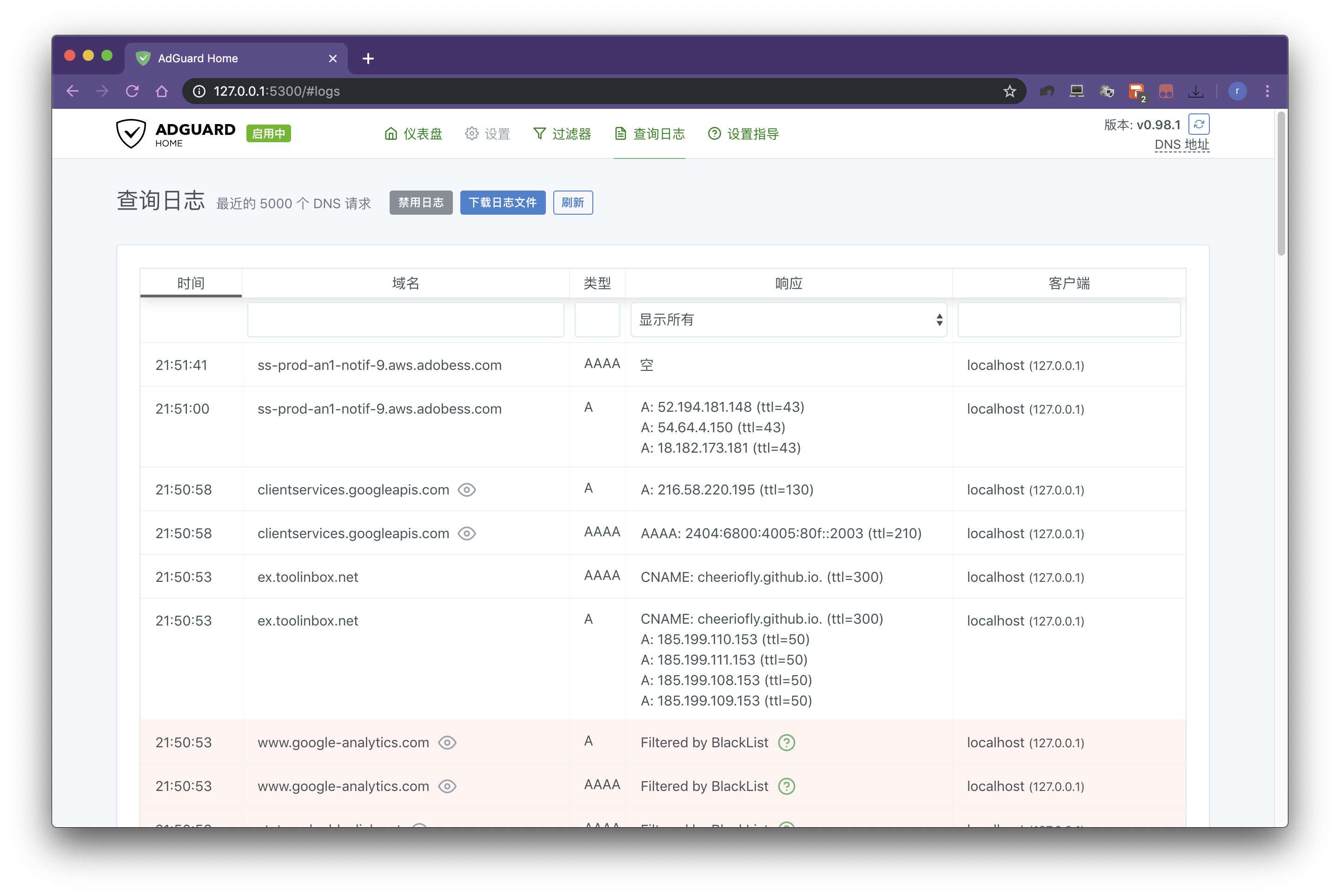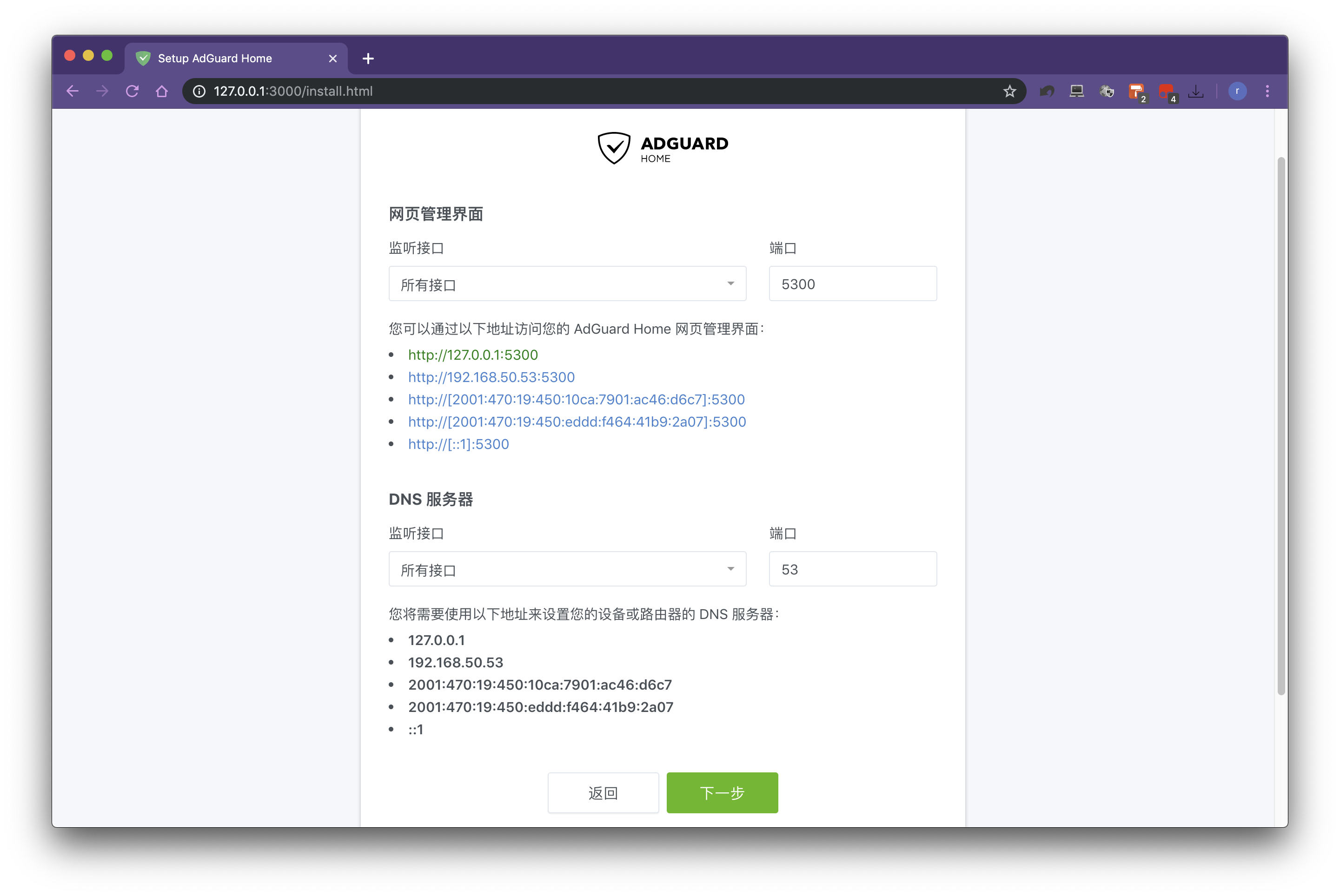 现在就可以在浏览器中通过 url http://127.0.0.1/ 来访问 AdGuard Home 的管理界面啦~