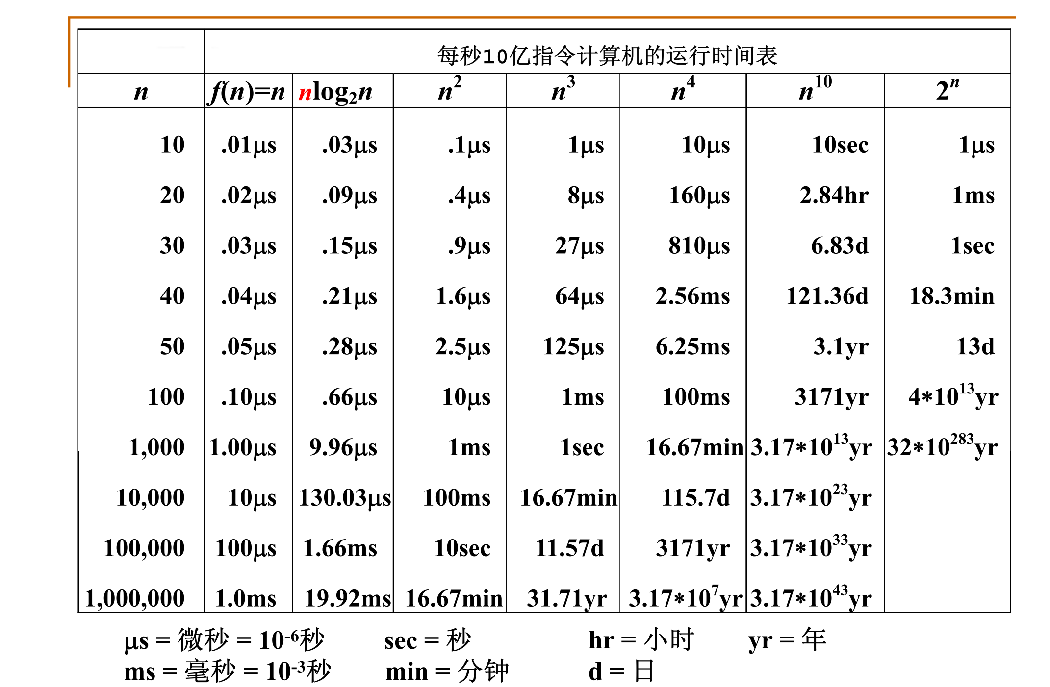 时间复杂度T(n) ——根据算法写成的程序在执行时 耗费时间的长度。这个长度往往也与输入数据的规 模有关。时间复杂度过高的低效算法可能导致我们 在有生之年都等不到运行结果。
