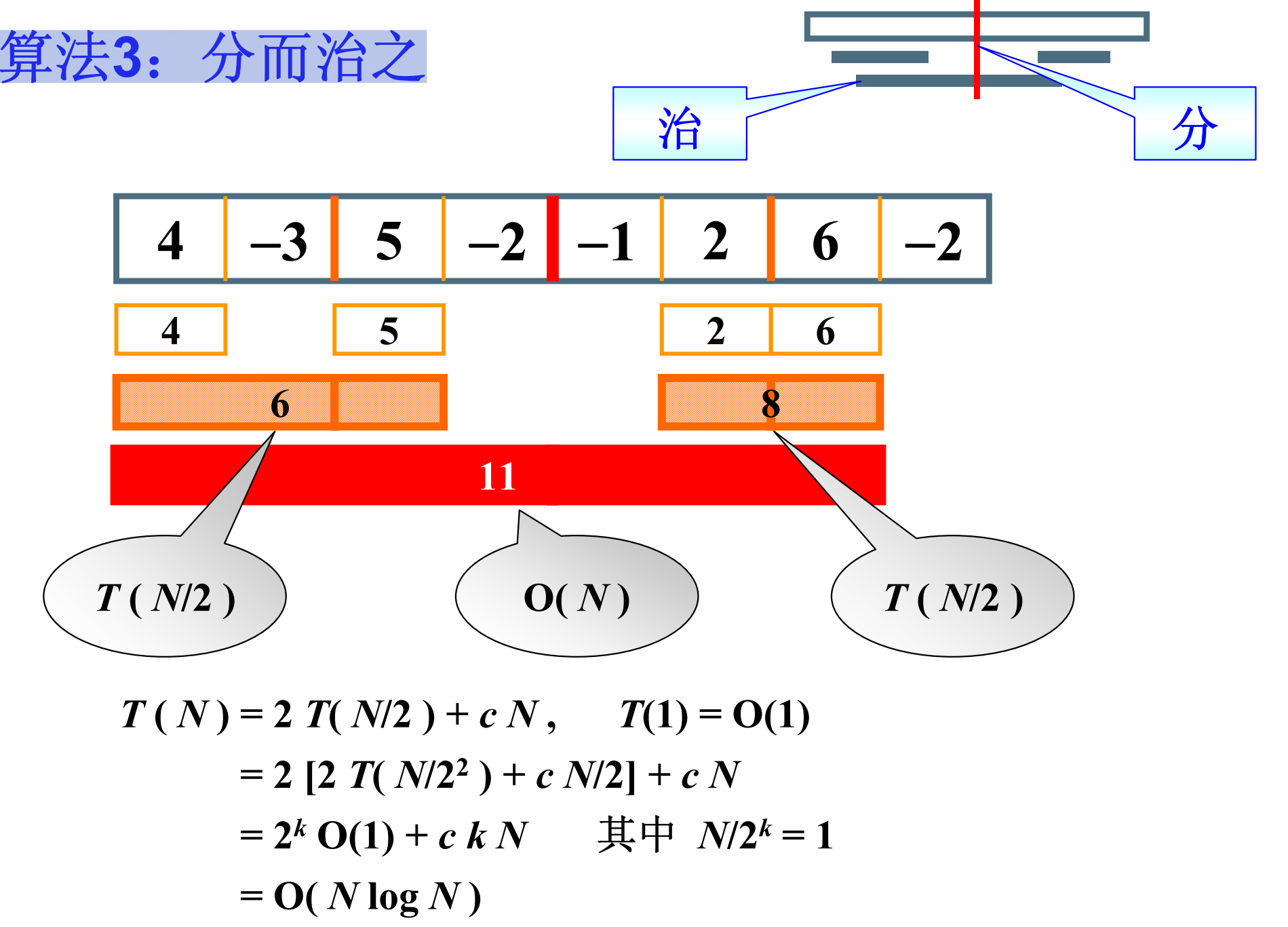应用在最大子列和问题上,即将存储数据的数组看成左右两部分,分别求出两部分的最大子列和以及贯穿中间线的最大子列和,三个部分中的最大部分即我们要求的最大子列和。