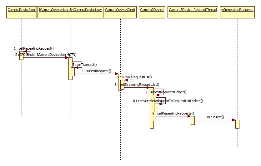 首先调用CameraDeviceImpl的createCaptureRequest方法创建类型为TEMPLATE_PREVIEW 的CaptureRequest,然后调用CameraCaptureSessionImpl的setRepeatingRequest方法将此请求发送出去: