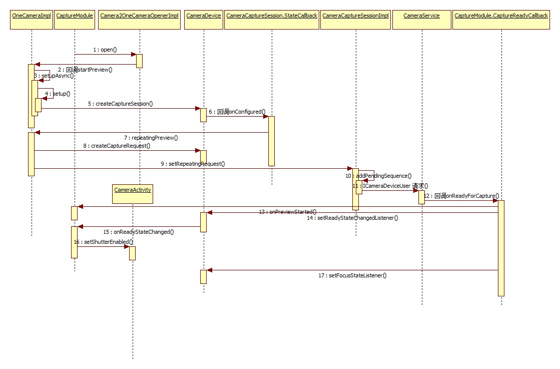 注意:Capture,preview以及autoFocus都是使用的这个回调,而Capture调用的时候,其RequestTag为CAPTURE,而autoFocus的时候为TAP_TO_FOCUS,而preview请求时没有对RequestTag进行设置,所以回调到onCaptureStarted方法时,不需要进行处理,但是到此时,preview已经启动成功,可以进行预览了,其数据都在buffer里。所以到此时,preview的流程全部分析结束,下面给出HAL层上的流程时序图