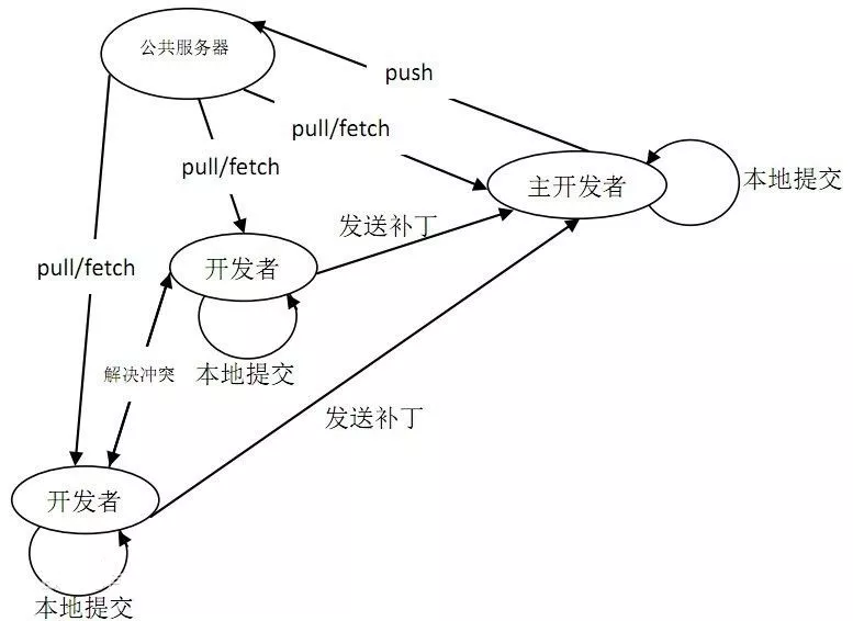8、一般开发者之间解决冲突的方法,开发者之间可以使用pull 命令解决冲突,解决完冲突之后再向主开发者提交补丁。