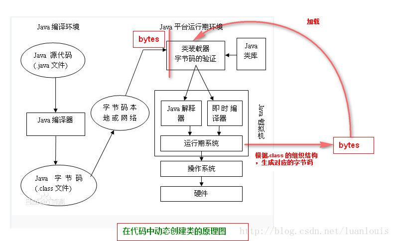 由于JVM通过字节码的二进制信息加载类的,那么,如果我们在运行期系统中,遵循Java编译系统组织.class文件的格式和结构,生成相应的二进制数据,然后再把这个二进制数据加载转换成对应的类,这样,就完成了在代码中,动态创建一个类的能力了。