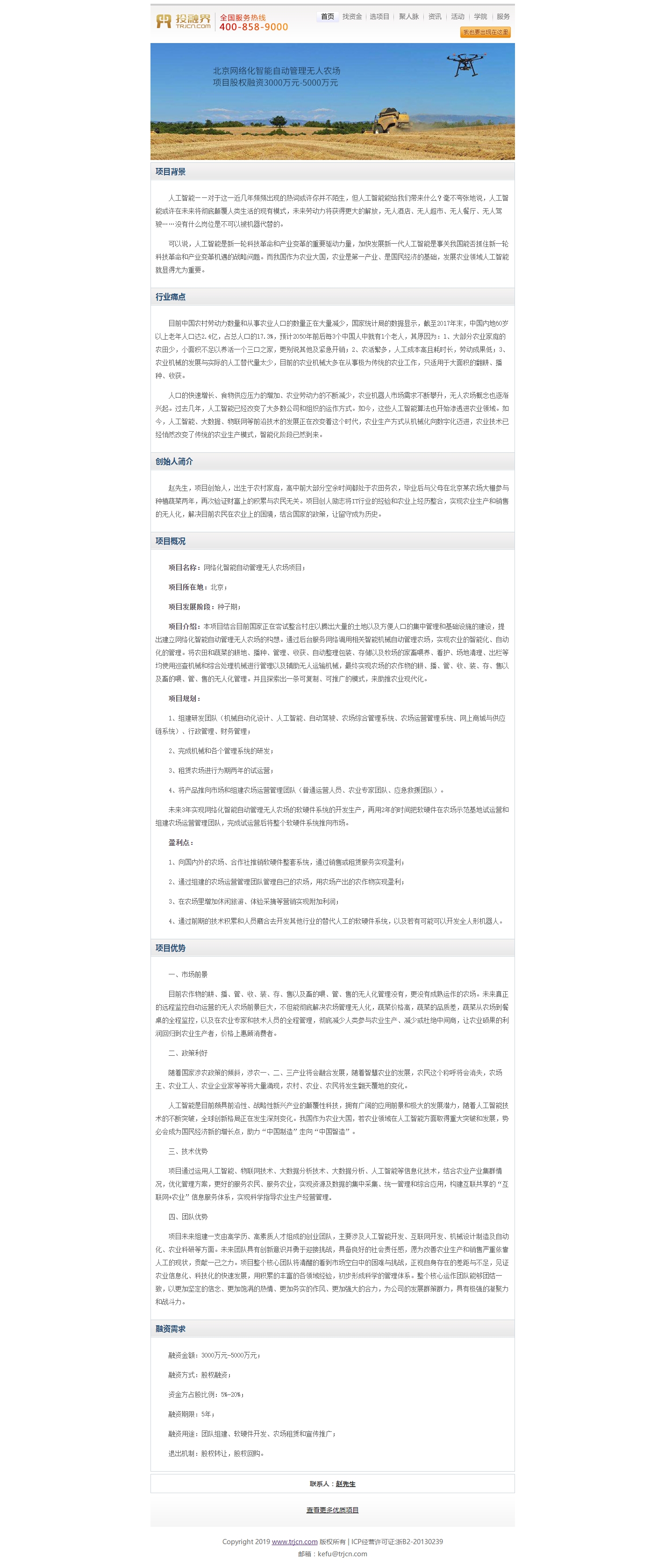 创业有项目,都写好项目商业计划书,需要团队创业,融资开启项目;有想一起创业的互联网、自动驾驶、人工智能和机械自动化的人吗,一起组队做物联网农业项目创业,创业项目名称为网络化智能管理无人农场,该项目已经在投资服务平台中发布,目前因没有团队无法进行融资来推动该项目,该项目的详细概述见图: