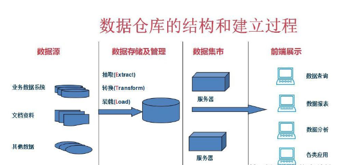 从上图可以看出,数据仓库的基本架构主要包含的是数据的流入和流程过程,可以分为三大部分——数据源、数据仓库(包括数据存储及管理和数据集市)以及数据应用(前端展示)。数据仓库的数据来自于不同的数据源,并提供多样的数据应用,数据自左向右流入数据仓库后向上层应用程序开放应用,而数据仓库只是中间集成化数据管理的一个平台。数据仓库从各数据源获取数据及在数据仓库内的转换和流动,都可以认为是ETL(抽取Extra,转化Transfer,装载Load)过程,ETL是数据仓库的流水线,也可以认为是数据仓库的血液,它维系着数据仓库中数据的新陈代谢,而数据仓库日常管理和维护工作的大部分精力就是保持ETL的正常运作和稳定。