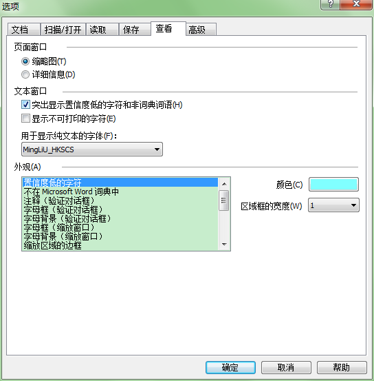 如果您需要在 ABBYY FineReader 的 Microsoft Word 而不是文本窗口中编辑已识别文本,选择突出显示置信度低的字符选项。如果选择该项,所有置信度低的字符将在 Microsoft Word 文档中突出显示。