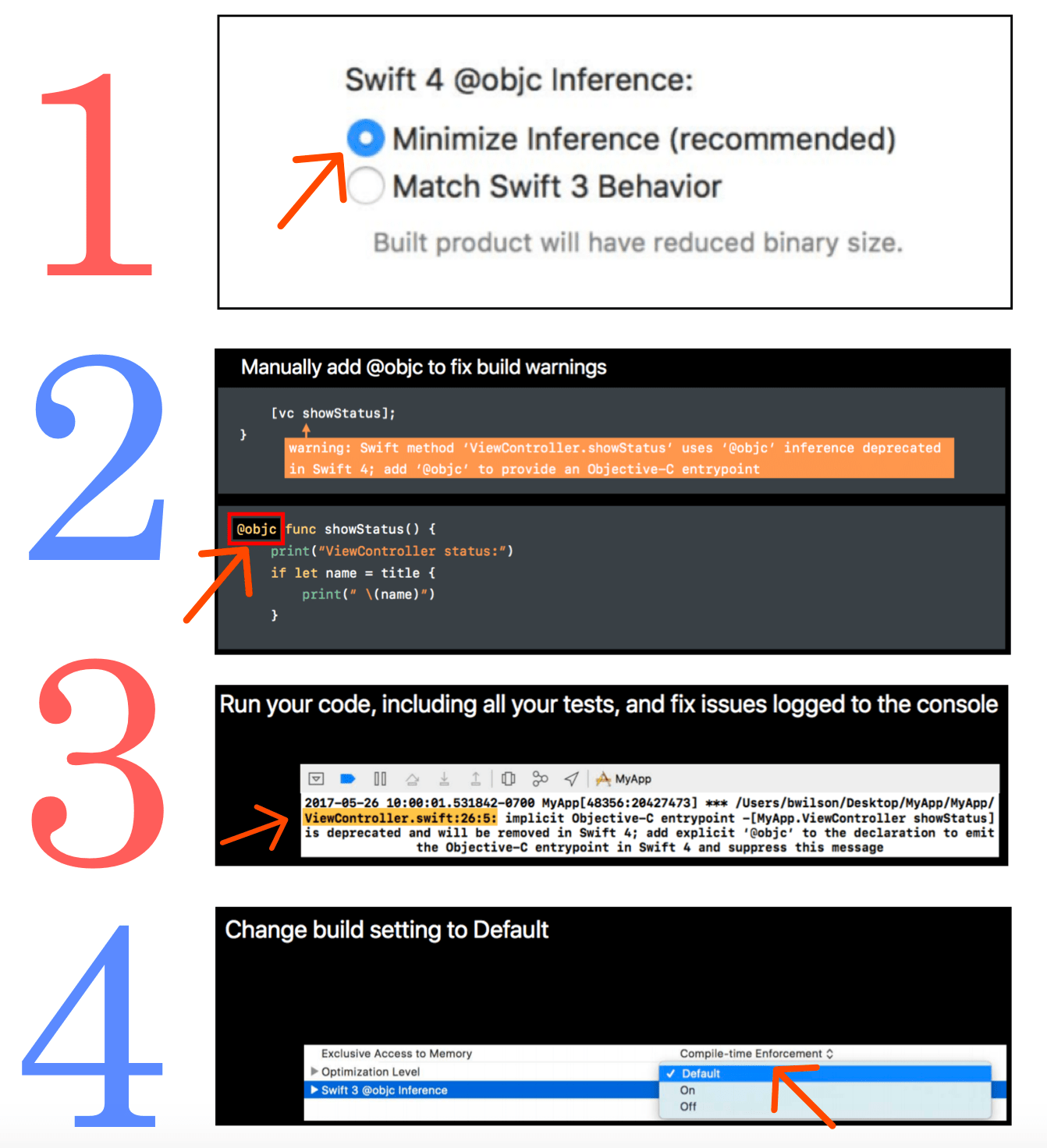After migrating to Swift 4, and setting "Swift 3 @objc Inference" to default, certain features of my project stopped working. It took me some debugging and research to find a solution for this. According to my best knowledge, here are the options: