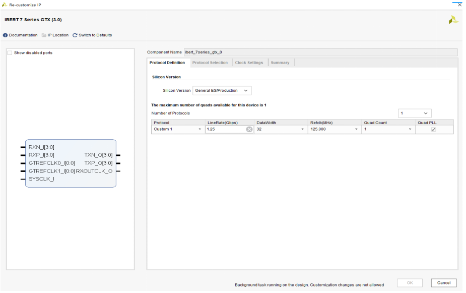 我们以MZ7035FD为例,IBERT测试协议选择Custom1,GTX参考时钟选择频率选择125MHz,只需要测试与SFP连接的4组GTX(MZ7035有2组SFP,MZ7035FB(D)有四组SFP),所以GTX Quad选择1。如下图所示。千兆以太网使用了1000BASEX标准,采用了8b/10b编码方式,所以GTX的传输速率为1000Mbps×10/8=1250Mbps=1.25Gbps。如下图所示。采用Custom1协议,我们暂且不研究这个协议内容,传输速率为1.25Gbps。