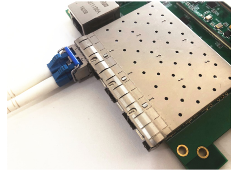 用户可将千兆光模块插入任意1个SFP屏蔽笼内,也可以同时使用2、3、4个光模块插入相应的屏蔽笼内。本教程测试时只使用了1个光模块,插入丝印“SFPA”所对应的屏蔽笼,如下图所示。