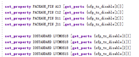 然后,在xdc文件中添加sfp_tx_disable引脚的约束即可,如下图所示。注意:不同的开发板管脚定义不一样