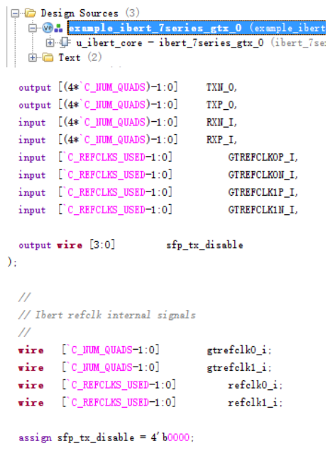 由于开发板的SFP屏蔽笼的tx_disable引脚都默认接了上拉电阻。要使收发回环测试可以正常进行,必须要将tx_disable引脚拉低。因此,在example design的顶层模块,添加4个sfp_tx_disable引脚,且均置为0即可。如下图所示。