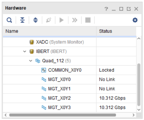 使用单根光纤,将光模块的TX和RX短接。然后,给开发板上电,在vivado中打开hardware manager,将刚才生成的bit文件下载到开发板中。下载完成后,出现如下图所示的界面。