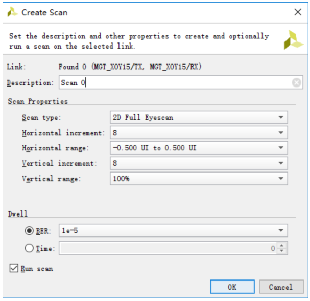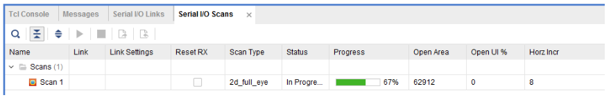 此时vivado开始进行眼图扫描和生成,用户需要稍等片刻,等到Progress进度为100%时,眼图扫描过程便结束。