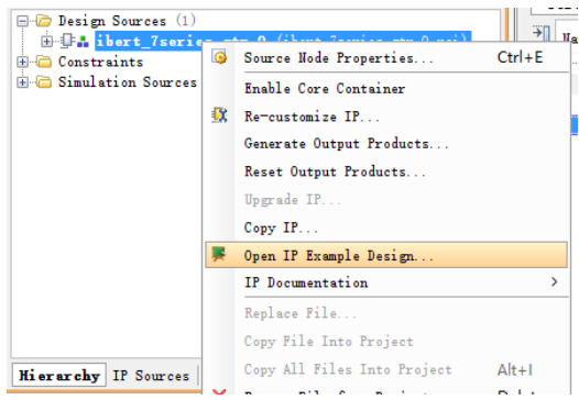 在IBERT IP核配置完成后,右击打开example design工程。