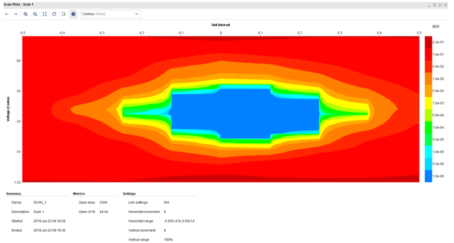 同理,扫描10.3125Gbps的眼图,如下图所示。10.3125Gbps速率下的眼图蓝色区域明显小于1.25Gbps速率时的眼图,而且形状发生了改变,变得有点像椭圆。这与信号的频率有关,信号的频率越高,在传输过程中的损耗越大,上下沿越来越平缓,方波会变得越来越像正弦波,眼图也会“睁得”越来越小。若使用更高的速率,眼图中的蓝色区域可能会变得更小。