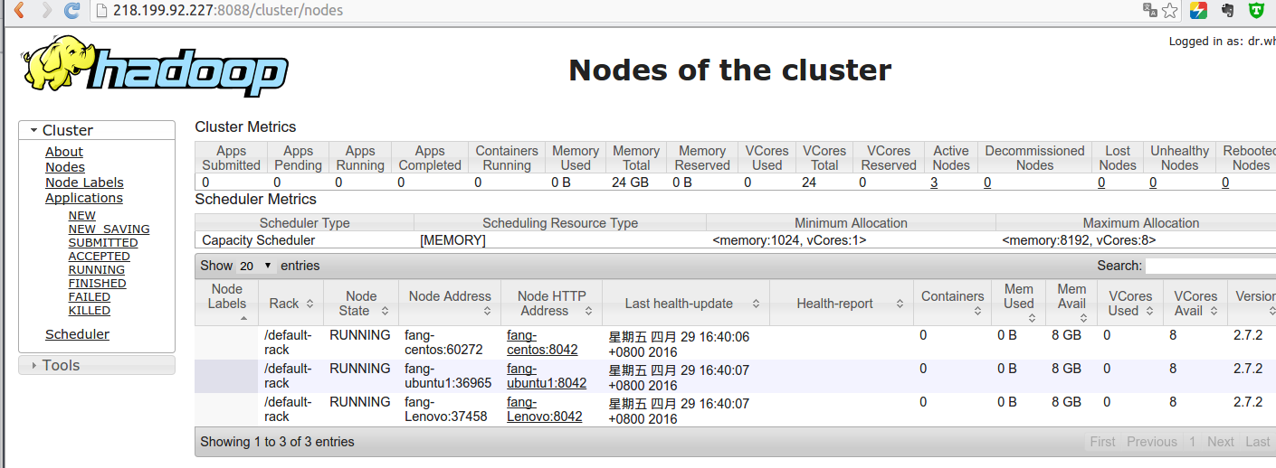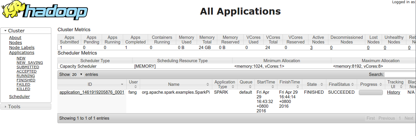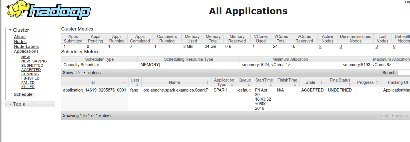 在浏览器中输入 http://fang-ubuntu1:8088 ,可以看到hadoop 的管理界面。