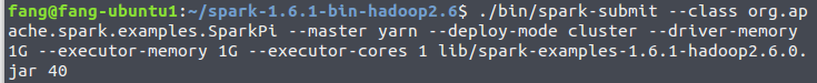 ./bin/spark-submit --class org.apache.spark.examples.SparkPi --master yarn --deploy-mode cluster --driver-memory 1G --executor-memory 1G --executor-cores 1 lib/spark-examples-1.6.1-hadoop2.6.0.jar 40