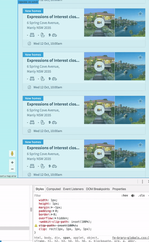 You did mention you tried will-change and it didn't have an effect, but trying it myself has worked out great. It belongs on the element that has overflow set, in this case its the .map-search__results selector. Add will-change: transform;. Once added, the "repaints on scroll" rect is gone. And measuring with timeline afterwards and it's MUCH better.