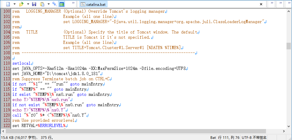 另种修改方法为修改tomcat安装路径/bin/catalina.bat文件,增加