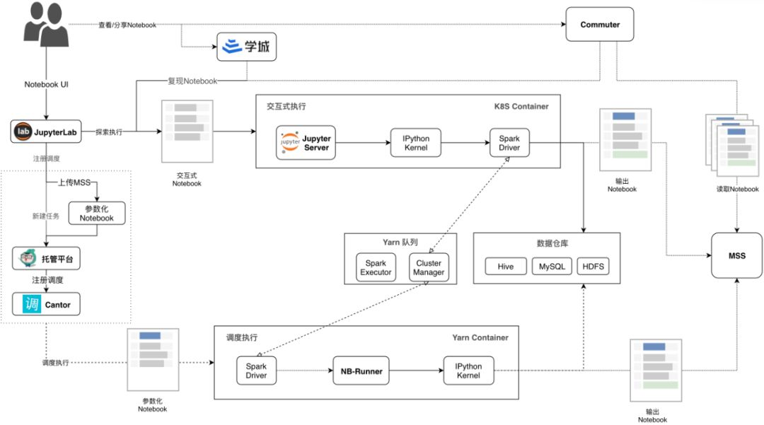 我们的方案是基于JupyterHub on K8s。下图是平台化Jupyter的架构图,从上到下可以看到三条主线:1. 分享复现、2. 探索执行、3. 调度执行。