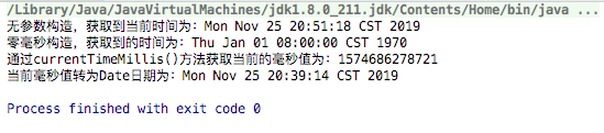System.out.println("无参数构造,获取到当前时间为:"+date);//Mon Nov 25 20:32:50 CST 2019