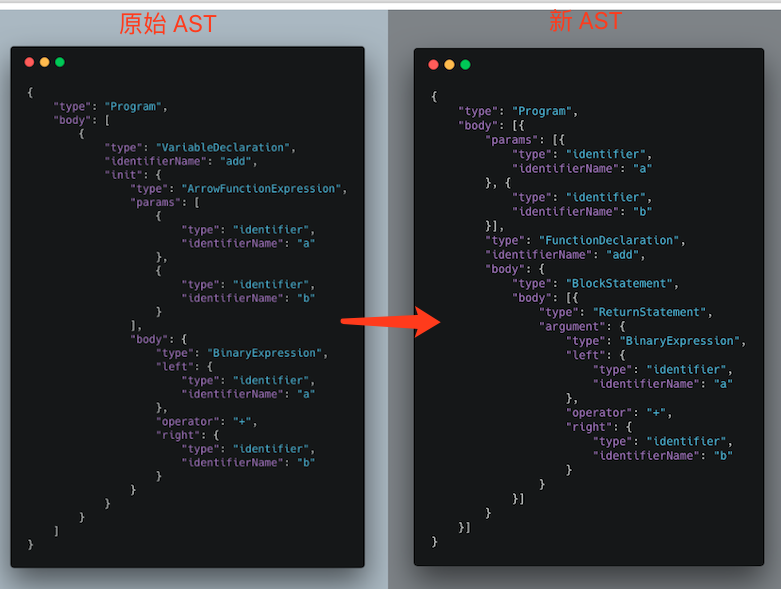 { "type": "Program", "body": [ { "type": "VariableDeclaration", "identifierName": "add", "init": { "type": "ArrowFunctionExpression", "params": [ { "type": "identifier", "identifierName": "a" }, { "type": "identifier", "identifierName": "b" } ], "body": { "type": "BinaryExpression", "left": { "type": "identifier", "identifierName": "a" }, "operator": "+", "right": { "type": "identifier", "identifierName": "b" } } } } ] } 代码转换