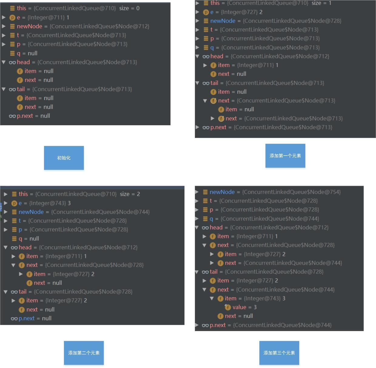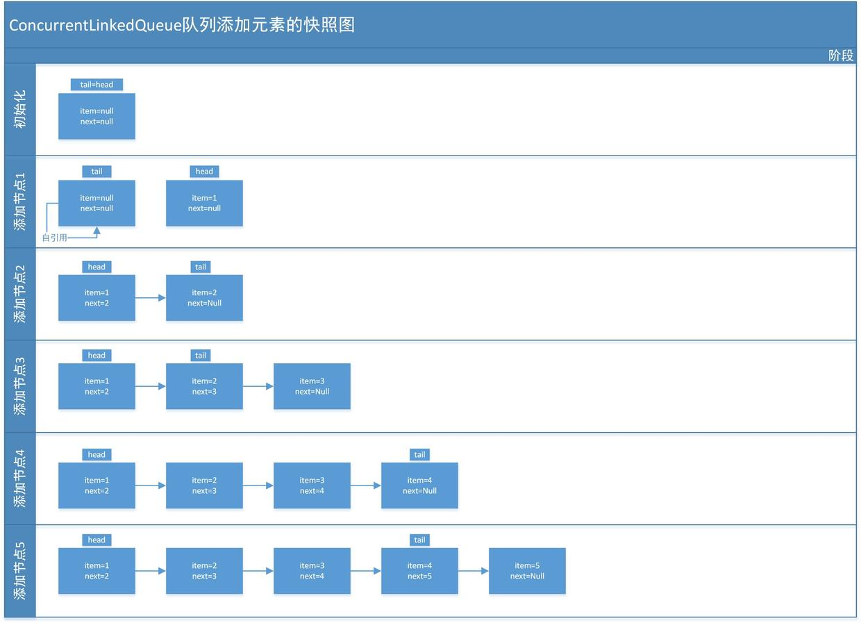 - ConcurrentLinkedQueue 是允许存NULL值的,NULL有特殊含义,表示已经从链表中移除(出队了)