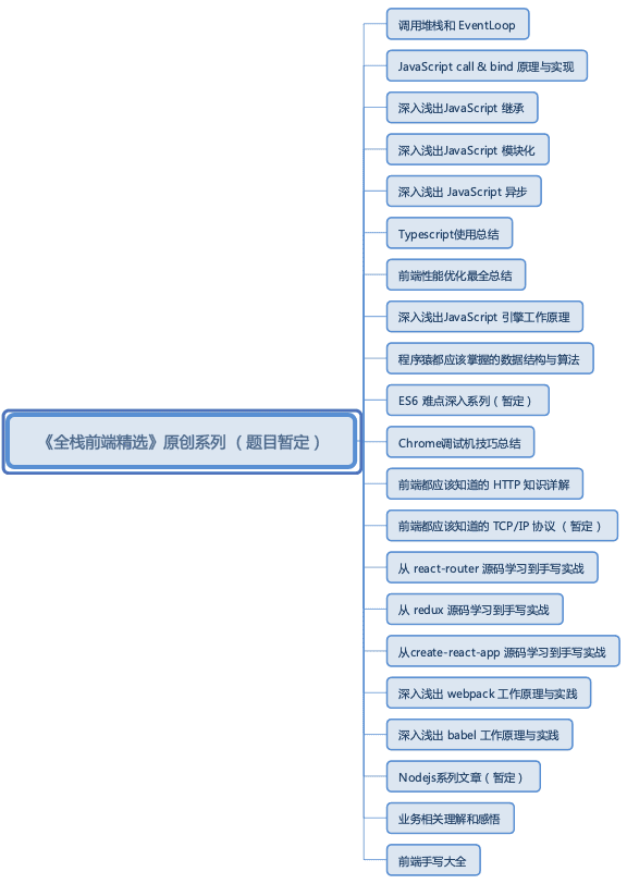 关于面试题的答案讲解,本文将不做非常详细的分析。具体的每个知识点,笔者后面尽量两周更新一篇相关知识点文章于公众号 全栈前端精选 中,欢迎关注、讨论和分享。下图是笔者计划后续写的总结性技术文章。