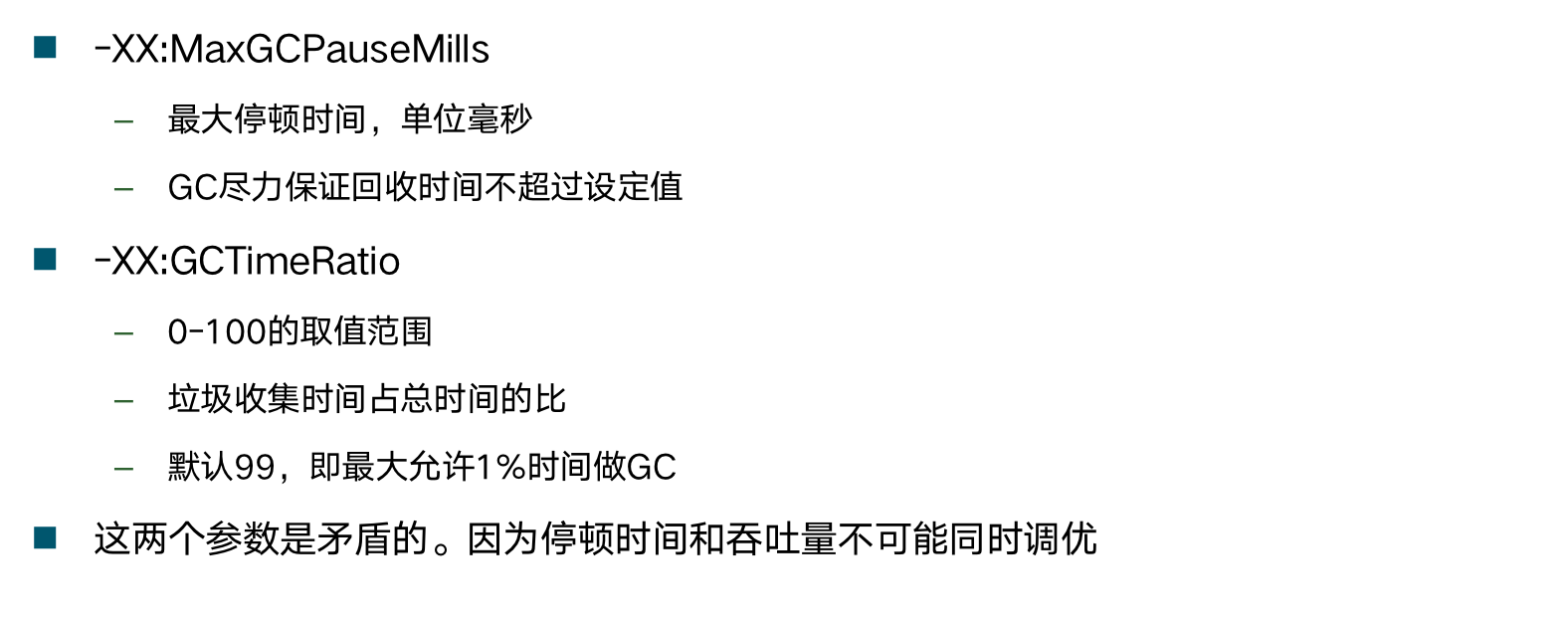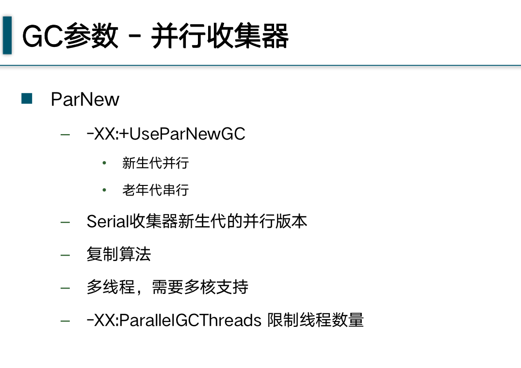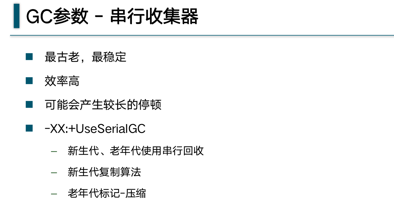 -XX:+UseSerialGC:在新生代和老年代使用串行收集器 -XX:SurvivorRatio:设置eden区大小和survivior区大小的比例 -XX:NewRatio:新生代和老年代的比 -XX:+UseParNewGC:在新生代使用并行收集器 -XX:+UseParallelGC :新生代使用并行回收收集器 -XX:+UseParallelOldGC:老年代使用并行回收收集器 -XX:ParallelGCThreads:设置用于垃圾回收的线程数 -XX:+UseConcMarkSweepGC:新生代使用并行收集器,老年代使用CMS+串行收集器 -XX:ParallelCMSThreads:设定CMS的线程数量 -XX:CMSInitiatingOccupancyFraction:设置CMS收集器在老年代空间被使用多少后触发 -XX:+UseCMSCompactAtFullCollection:设置CMS收集器在完成垃圾收集后是否要进行一次内存碎片的整理 -XX:CMSFullGCsBeforeCompaction:设定进行多少次CMS垃圾回收后,进行一次内存压缩 -XX:+CMSClassUnloadingEnabled:允许对类元数据进行回收 -XX:CMSInitiatingPermOccupancyFraction:当永久区占用率达到这一百分比时,启动CMS回收 -XX:UseCMSInitiatingOccupancyOnly:表示只在到达阀值的时候,才进行CMS回收