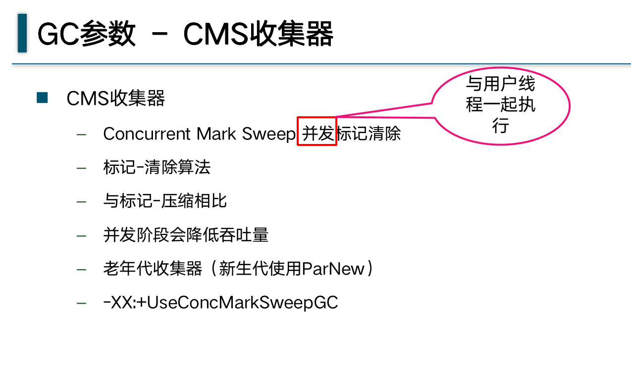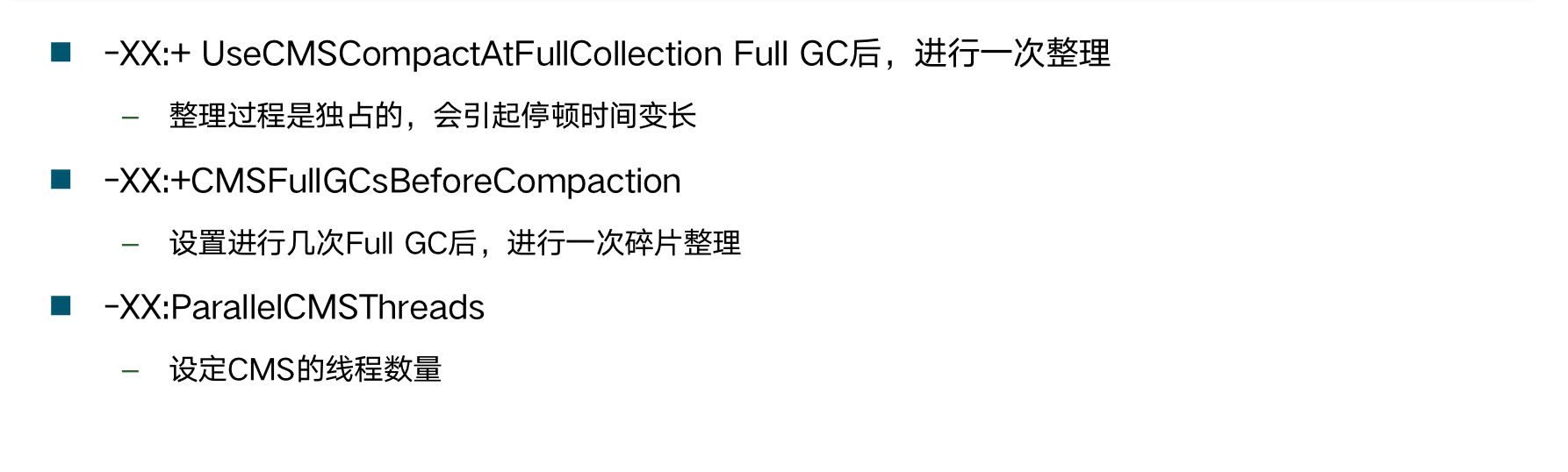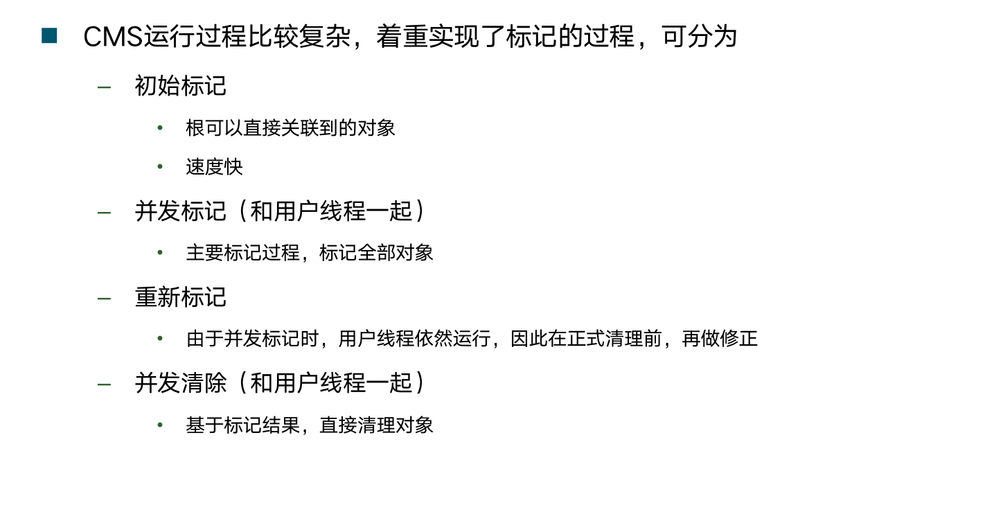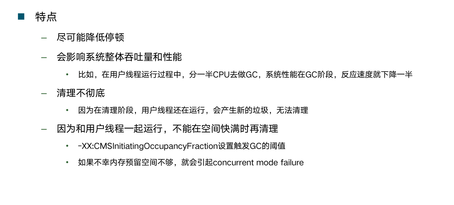 cms相对来说有以下特点: 1、能保证系统的响应时间,减少垃圾收集时的停顿时间,对一些做监控的应用优其重要。 2、Cms采用Mark-Sweep会对堆产生空间碎片,但是可以指定在经过几次垃圾回收后再做总的空间整理 3、虽然fgc回收时间相对比并行收集器少,但总的回收次数确是多的,所以会导致系统停顿次数变多,导致吞吐量下降。