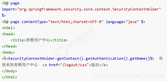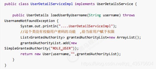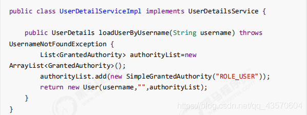 <?xml version="1.0" encoding="UTF‐8"?> <beans:beans xmlns="http://www.springframework.org/schema/security" xmlns:beans="http://www.springframework.org/schema/beans" xmlns:context="http://www.springframework.org/schema/context" xmlns:xsi="http://www.w3.org/2001/XMLSchema‐instance" xsi:schemaLocation="http://www.springframework.org/schema/beans http://www.springframework.org/schema/beans/spring‐beans.xsd http://www.springframework.org/schema/context http://www.springframework.org/schema/context/spring‐context.xsd http://www.springframework.org/schema/security http://www.springframework.org/schema/security/spring‐security.xsd"> <context:property‐placeholder location="classpath*:*.properties" /> <http pattern="/css/**" security="none"></http> <http pattern="/js/**" security="none"></http> <http pattern="/img/**" security="none"></http> <!‐‐ entry‐point‐ref 入口点引用 ‐‐> <http use‐expressions="false" entry‐point‐ref="casProcessingFilterEntryPoint"> <intercept‐url pattern="/**" access="ROLE_USER"/> <csrf disabled="true"/> <!‐‐ custom‐filter为过滤器, position 表示将过滤器放在指定的位置上,before表示放在指定位置之前 ,after表示放在指定的位置之后 ‐‐> <custom‐filter ref="casAuthenticationFilter" position="CAS_FILTER" /> <custom‐filter ref="requestSingleLogoutFilter" before="LOGOUT_FILTER"/> <custom‐filter ref="singleLogoutFilter" before="CAS_FILTER"/> </http> <!‐‐ CAS入口点 开始 ‐‐> <beans:bean id="casProcessingFilterEntryPoint" class="org.springframework.security.cas.web.CasAuthenticationEntryPoint"> <!‐‐ 单点登录服务器登录URL ‐‐> <beans:property name="loginUrl" value="${cas_url}/login"/> <beans:property name="serviceProperties"ref="serviceProperties"/> </beans:bean> <beans:bean id="serviceProperties" class="org.springframework.security.cas.ServiceProperties"> <!‐‐service 配置自身工程的根地址+/login/cas ‐‐> <beans:property name="service" value="${service_url}/login/cas"/> </beans:bean> <!‐‐ CAS入口点 结束 ‐‐> <!‐‐ 认证过滤器 开始 ‐‐> <beans:bean id="casAuthenticationFilter" class="org.springframework.security.cas.web.CasAuthenticationFilter"> <beans:property name="authenticationManager" ref="authenticationManager"/> </beans:bean> <!‐‐ 认证管理器 ‐‐> <authentication‐manager alias="authenticationManager"> <authentication‐provider ref="casAuthenticationProvider"> </authentication‐provider> </authentication‐manager> <!‐‐ 认证提供者 ‐‐> <beans:bean id="casAuthenticationProvider" class="org.springframework.security.cas.authentication.CasAuthenticationProvider"> <beans:property name="authenticationUserDetailsService"> <beans:bean class="org.springframework.security.core.userdetails.UserDetailsByNameServiceWrapper"> <beans:constructor‐arg ref="userDetailsService" /> </beans:bean> </beans:property> <beans:property name="serviceProperties"ref="serviceProperties"/> <!‐‐ ticketValidator 为票据验证器 ‐‐> <beans:property name="ticketValidator"> <beans:bean class="org.jasig.cas.client.validation.Cas20ServiceTicketValidator"> <beans:constructor‐arg index="0" value="${cas_url}"/> </beans:bean> </beans:property> <beans:property name="key" value="an_id_for_this_auth_provider_only"/> </beans:bean> <!‐‐ 认证类 ‐‐> <beans:bean id="userDetailsService" class="com.qingcheng.service.UserDetailServiceImpl"/> <!‐‐ 认证过滤器 结束 ‐‐> <!‐‐ 单点登出 开始 ‐‐> <beans:bean id="singleLogoutFilter" class="org.jasig.cas.client.session.SingleSignOutFilter"/> <beans:bean id="requestSingleLogoutFilter" class="org.springframework.security.web.authentication.logout.LogoutFilte r"> <beans:constructor‐arg value="${cas_url}/logout"/> <beans:constructor‐arg> <beans:bean class="org.springframework.security.web.authentication.logout.SecurityCon textLogoutHandler"/> </beans:constructor‐arg> <beans:property name="filterProcessesUrl" value="/logout/cas"/> </beans:bean> <!‐‐ 单点登出 结束 ‐‐> </beans:beans> - qingcheng_common_cas工程创建UserDetailServiceImpl
