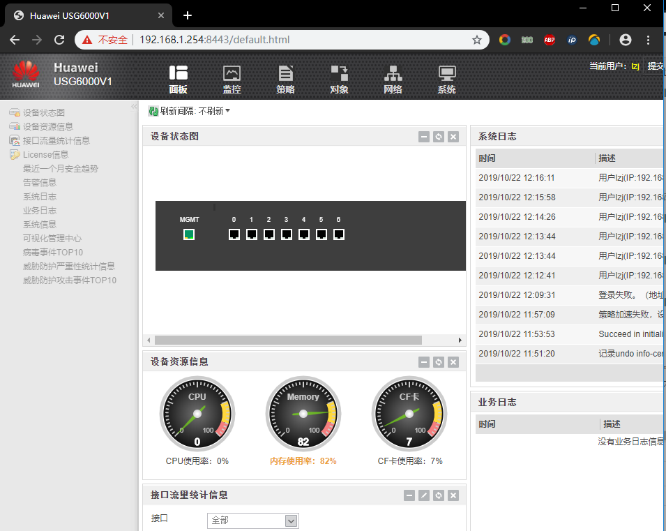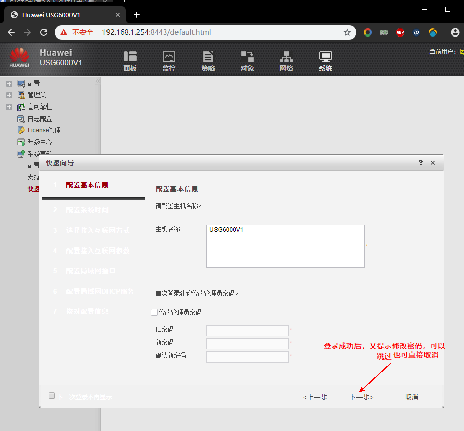 [USG6000V1-GigabitEthernet0/0/0]ip add 192.168.1.254 24