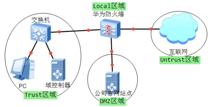 华为防火墙默认有四个区域,分别是Trust、Untrust、DMZ和local。