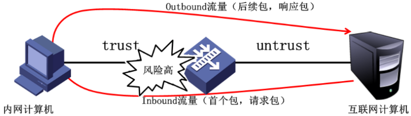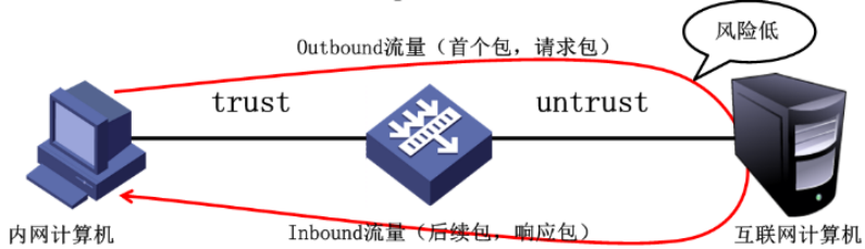 出方向(Outbound):数据由高级别的安全区域向低级别的安全区域传输的方向。