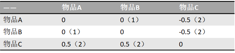 这个矩阵反映了这些事实:用户1给物品A、C评分,分别是5、2;用户2给物品B、C评分,分别是4、3;用户3给物品A、B、C评分,分别是3、3、5。现在,先来两两计算物品之间的平均距离,如下表所示。