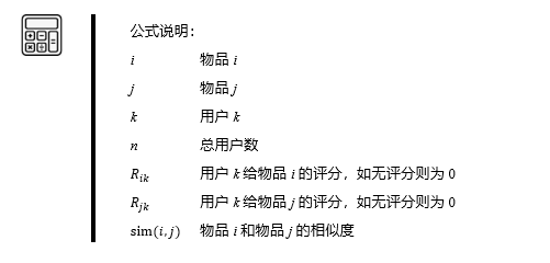 - 假如矩阵的行表示物品,列表示用户,则两两计算行向量之间的相似度,可以得到物品相似度矩阵,行和列都表示物品。