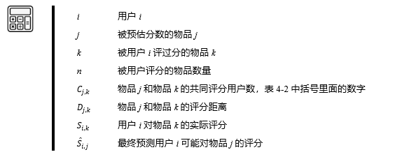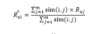 用这个距离矩阵去预测那些还没有被用户评分的物品会被用户评多少分,方式就是根据用户已经评分的物品,以及物品之间的评分距离来推算,公式如下: