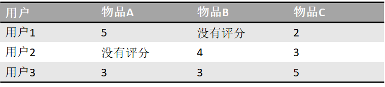 Slope One算法针对这些问题做了改进。Slope One算法专门针对评分矩阵,不适用于行为矩阵。Slope One算法计算的不是物品之间的相似度,而是物品之间的距离,即相似度的反面。举个例子就一目了然了。下表是一个简单的评分矩阵。