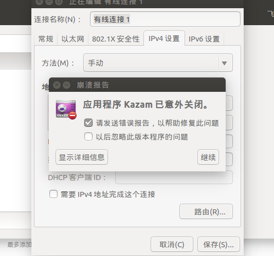 4.保存之后就设置好了,断开其他网络,打开有线连接,可以在Ubuntu的终端中查看ip是否设置好了。