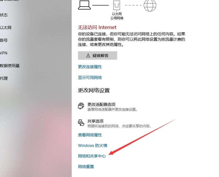 1.打开“打开网络和Internet”设置。点击网络和共享中心。
