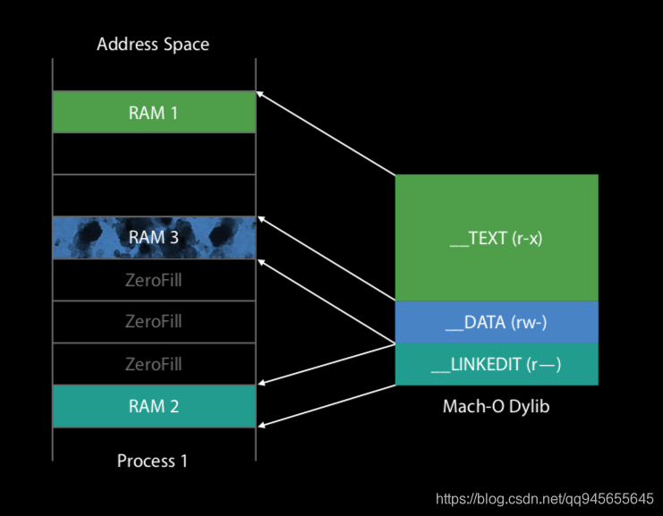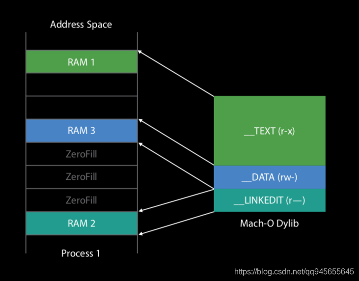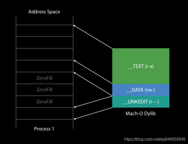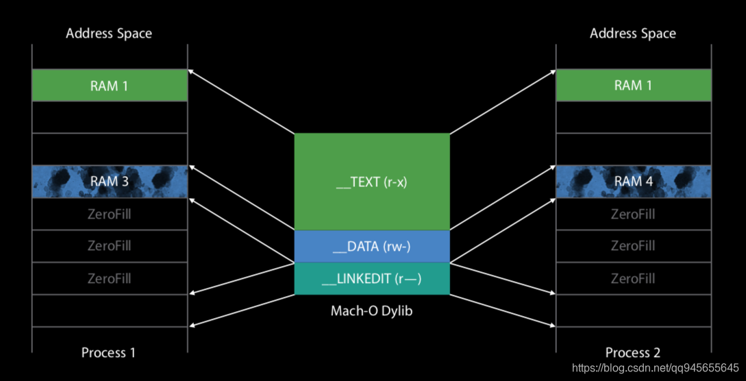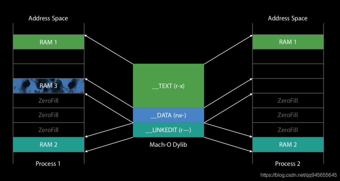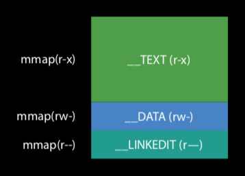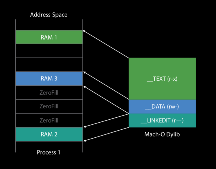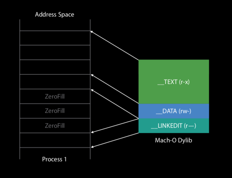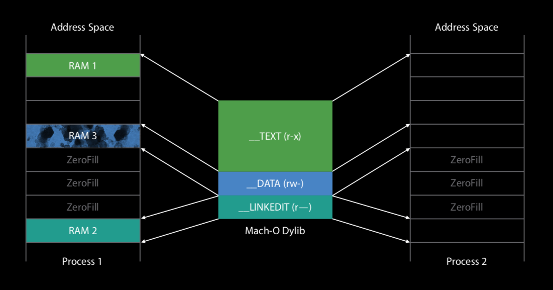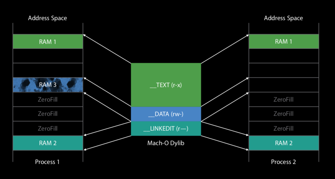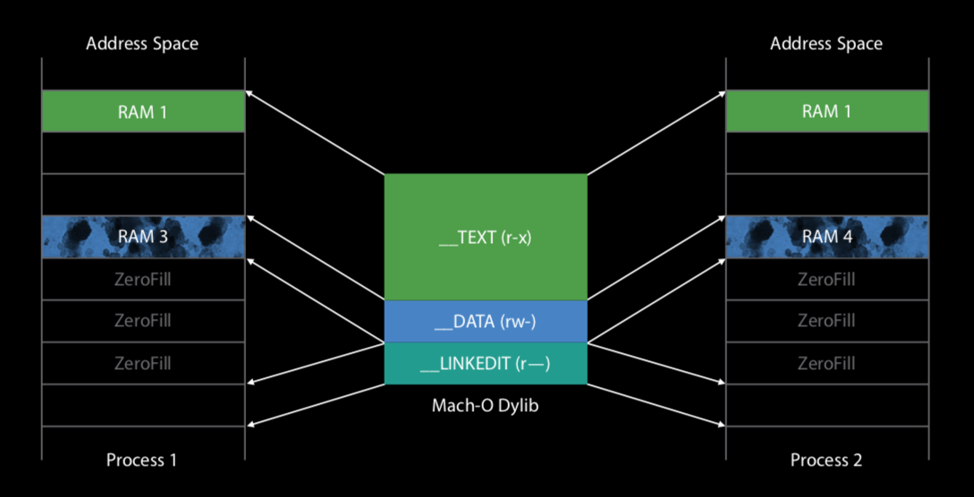 现在,结合 Mach-O 和虚拟内存的知识,我们可以知道 动态库(dylib)或者映像(image)中的 __TEXT 段可以被映射到不同的进程中。它可以被懒加载,还可以在不同的进程中共享。