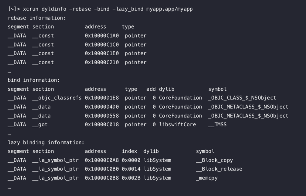 在内核将 __LINKEDIT 段读取到内存页之后,动态加载器可以正常使用 __LINKEDIT 段。__LINKEDIT 中指明了需要将 __DATA 页的某些信息修补后才能正常运行这个动态库。