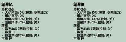 左右两个笔刷分别为A、B。设定好笔压、散步,画笔自然的描绘一下就好了,具体参照下面。实际使用的时候会比上图所示的尺寸小一些。没有这笔刷的童鞋,就用上面的两幅画来新建笔刷也可以。可在编辑栏里自定义笔刷。