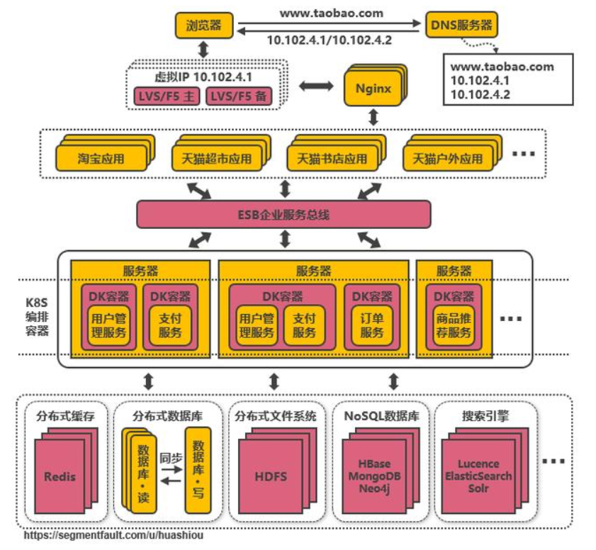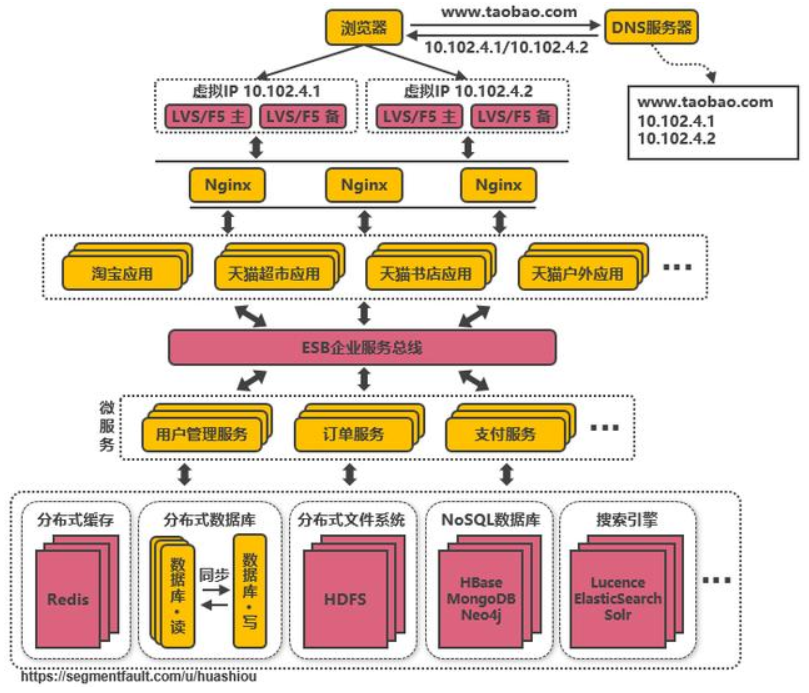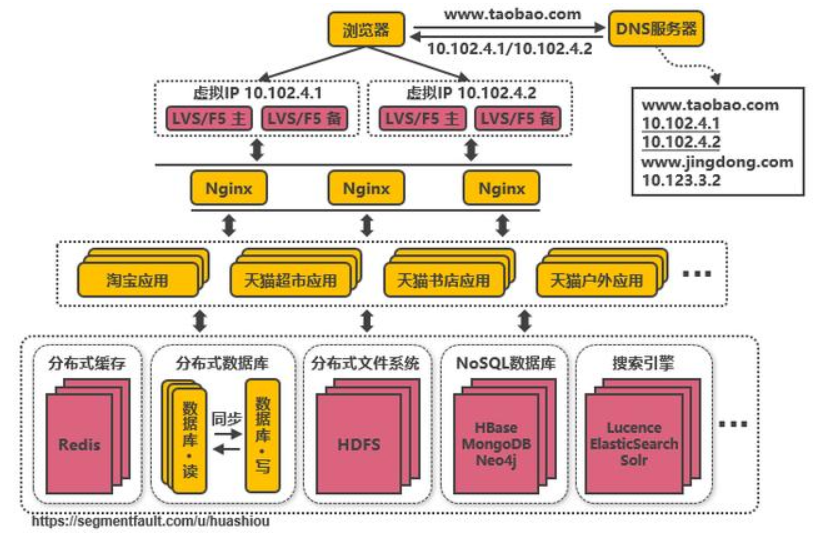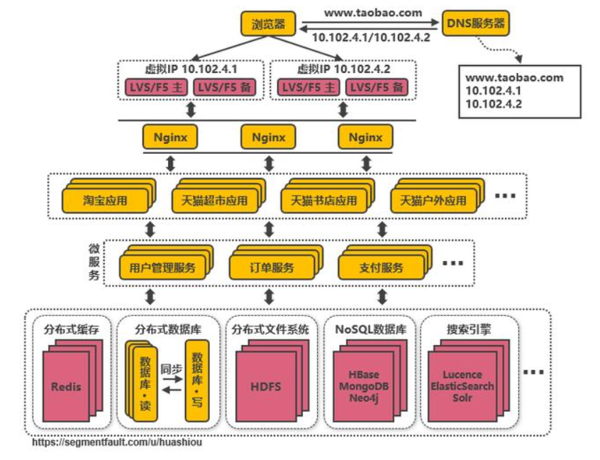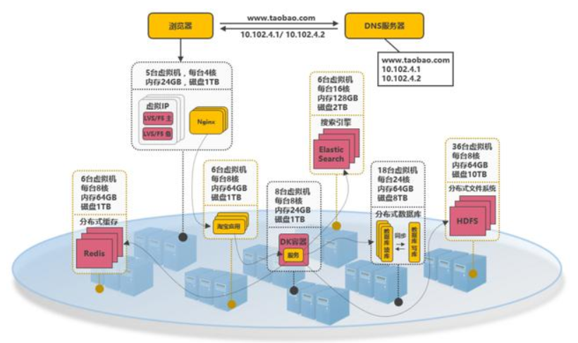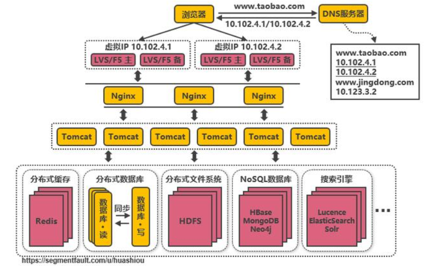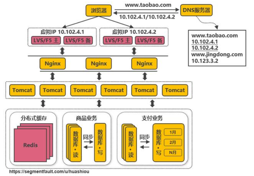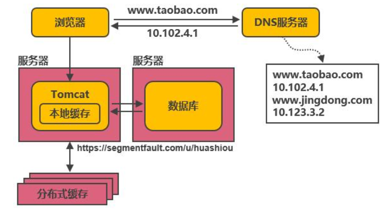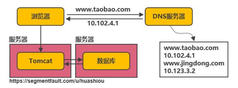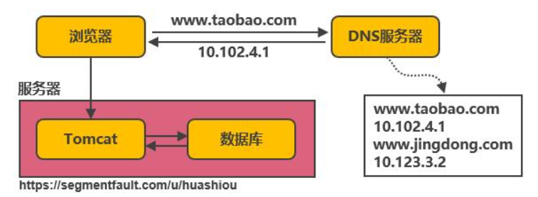 www.taobao.com发起请求时,首先经过DNS服务器(域名系统)把域名转换为实际IP地址10.102.4.1,浏览器转而访问该IP对应的Tomcat。